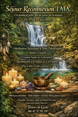 Prochaines Conférences : 22 mai 2026 salle de l’Ermitage à Digne les Bains de 19h à 21h . Prochains Stages : En attente de programmation. Activités Connexes : Notre amie Stéphanie des « Trésors de Gaïa » organise un « séjour de reconnexion TAÏA » du 22 au 24 mai 2026 à Chaudon-Norante, voir ci-dessous.